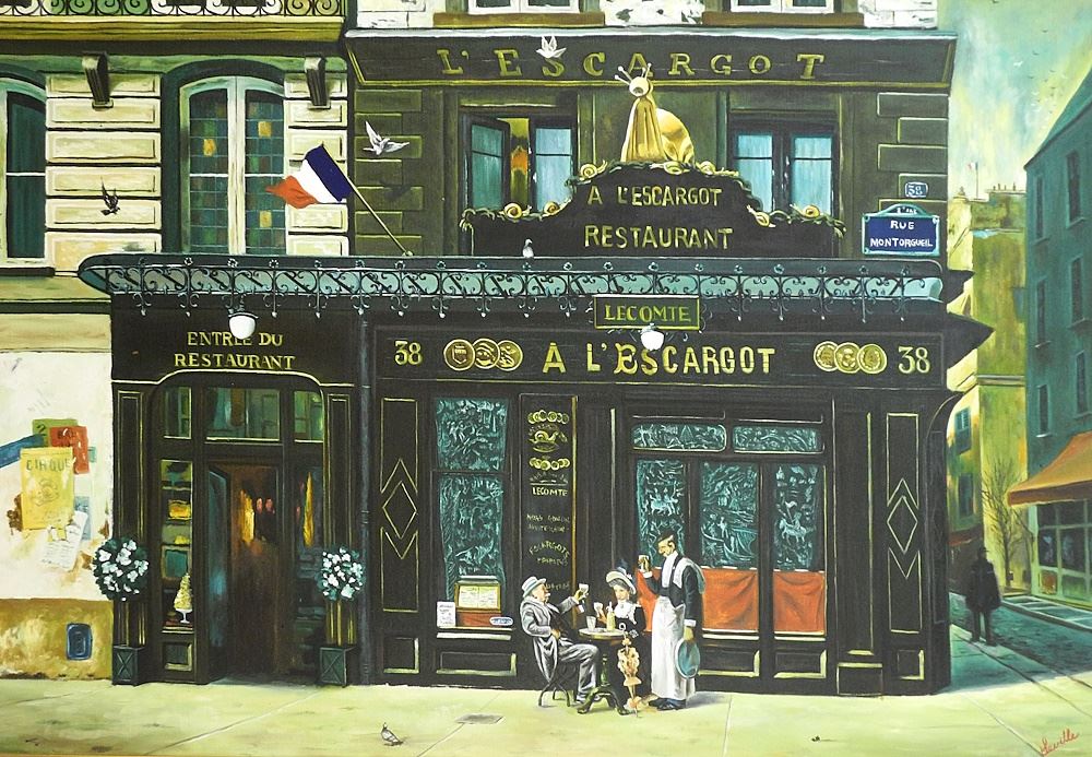 LOT 23 Oil on Canvas signed Seville, 23 1/2 x 35 1/2", "L'Escargot Paris". Estimate: $120 - $180 Sold For: $250 Auction Date: Tuesday, January 16 2024 at 4:00 PM
