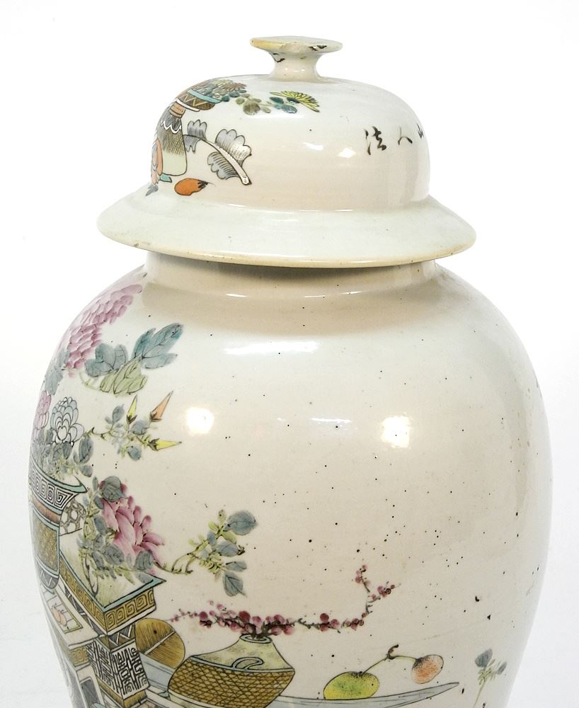 Chinese Famille Rose Porcelain "Antiques" Covered Vase, 17 1/2"H (chip noted).