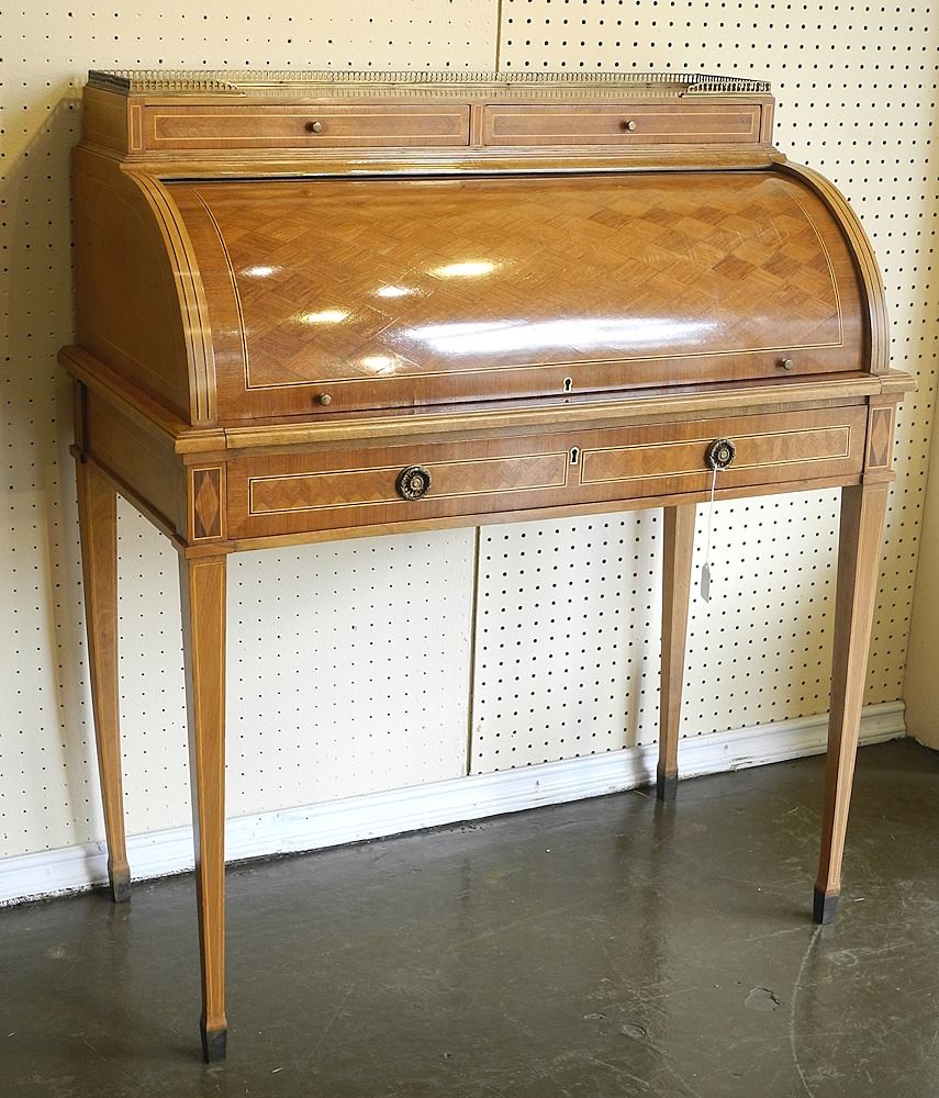 LOT 118 Louis XVI Parquetry Cylinder Desk, 39 1/4" x 34 1/8" x 17 1/2". Estimate: $300 - $500 Sold For: $250 Auction Date: Tuesday, June 11 2024 at 4:00 PM