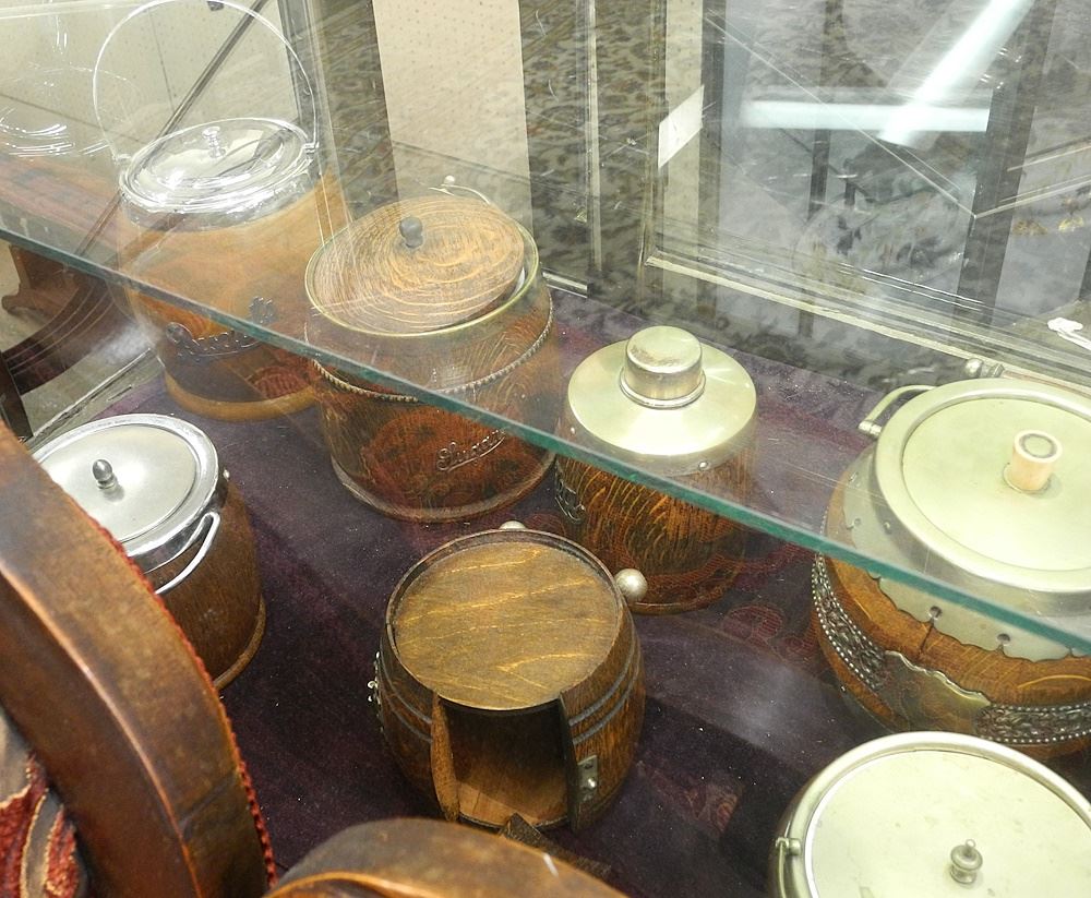 LOT 116 Collection of Oak & Other Biscuit Barrels / Tea Barrels / Sardine Barrels. Estimate: $150 - $300 Sold For: $80 Auction Date: Tuesday, June 11 2024 at 4:00 PM