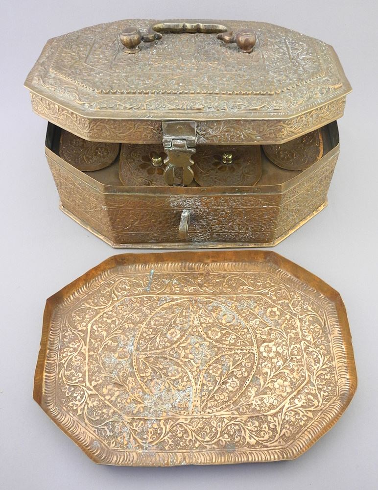 LOT 73 Embossed Copper Betel Nut Box, Tray & 5 Compartments, 5 1/4" x 11 1/4" x 8 1/4". Estimate: $100 - $150 Sold For: $80 Auction Date: Tuesday, June 11 2024 at 4:00 PM