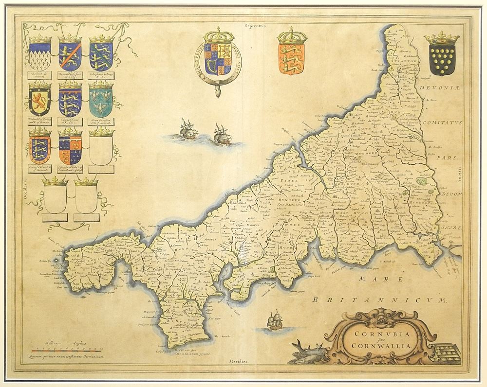 Antique Map: "Cornubiasive Cornwallia", Johannes Blaeu 1659, 15 3/4" x 20" (toning note