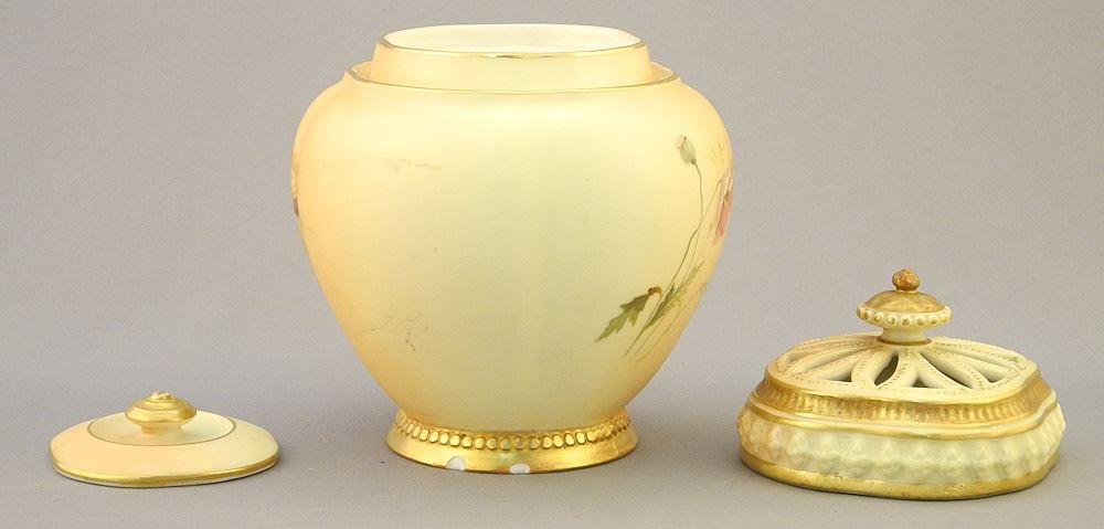 LOT 209 Royal Worcester Potpourri / Pitcher / Vase (chips noted), 5"-8"h. Estimate: $100 - $200 Sold For: $140 Auction Date: Tuesday, June 11 2024 at 4:00 PM