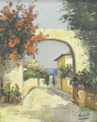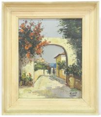 Oil on Canvas signed Sorelli, 12" x 9 1/2", "Italian Coastal Scene Through Arch".