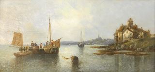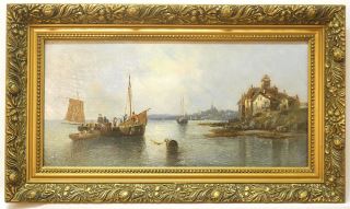 LOT 63 Unsigned 19th C. Oil on Board, 8 7/8" x 18", "Coastal Harbour Scene". Estimate: $60 - $100 Sold For: $90 Auction Date: Tuesday, August 20 2024 at 4:00 PM