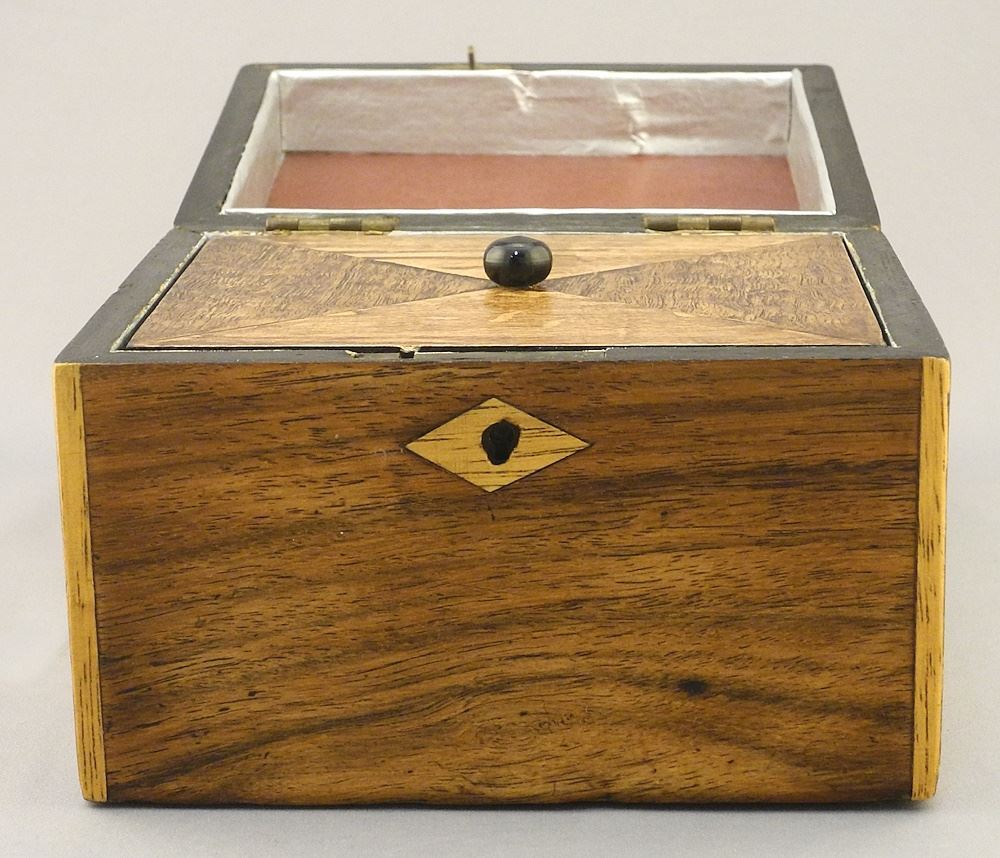 LOT 192 Banded Mahogany Tea Caddy, 4 1/4" x 5 5/8" x 4 3/4". Estimate: $100 - $150 Auction Date: Tuesday, August 20 2024 at 4:00 PM
