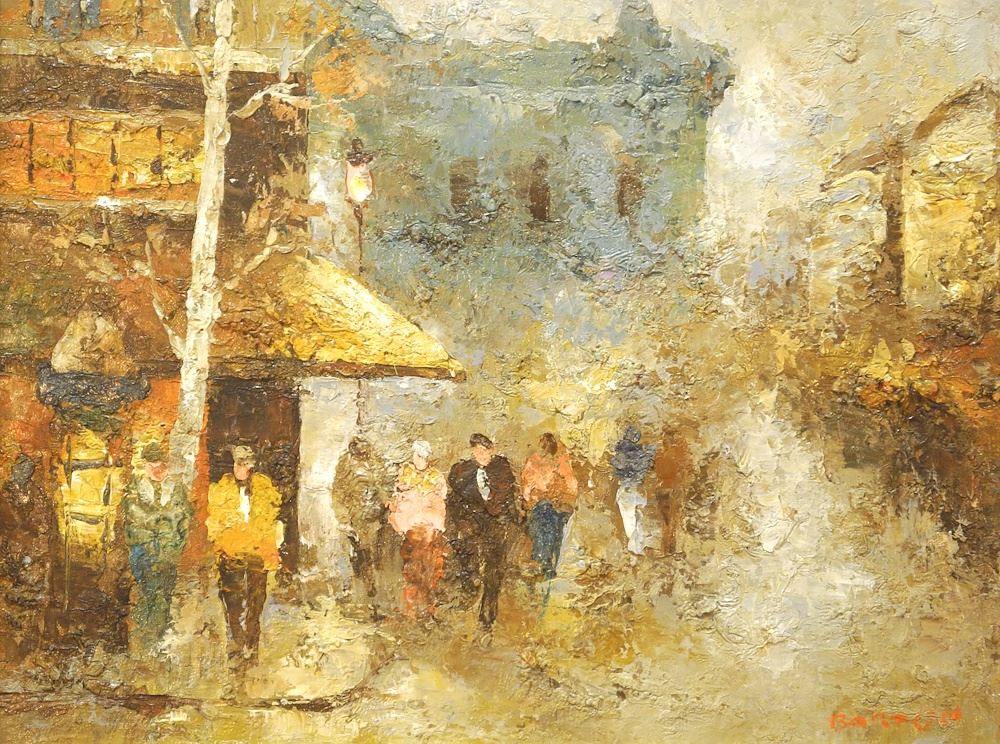 Oil on Canvas signed (Edward) Barton , 16" x 20", "Figures Huddled on a Street".