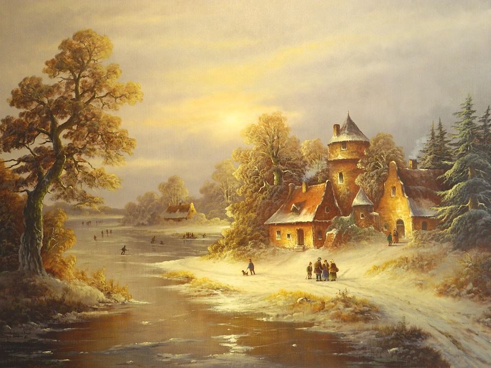 Oil on Canvas signed (Hans Joachim) Spichalski, 30" x 40", "European Winter Scene with Skaters"