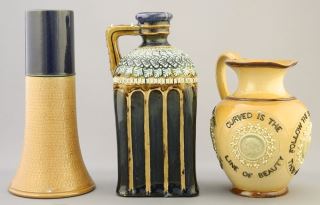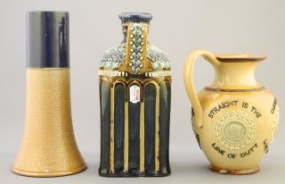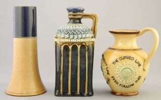 LOT 75A 4 Doulton Stoneware Items: 2 Jugs / Low Dish / Tapered Vase, 1 3/4" - 8" h. Estimate: $150 - $200 Auction Date: Tuesday, August 20 2024 at 4:00 PM