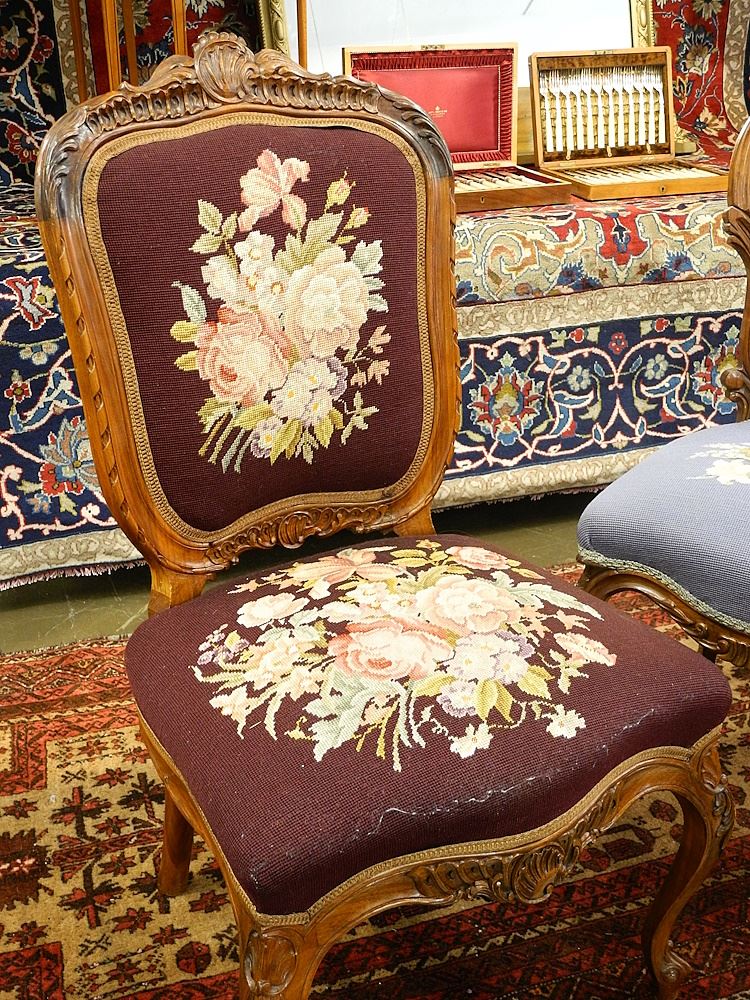 2 x 19th C. Carved Wood Side Chairs with Needlepoint Seats.
