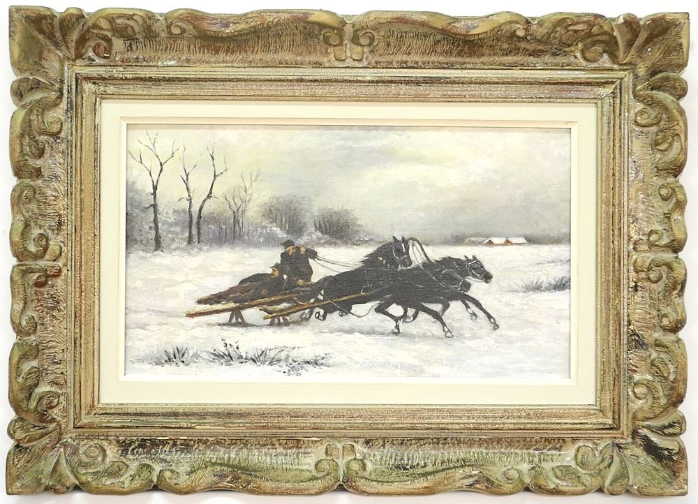 LOT 54 Russian School Oil on Canvas, 10 1/2" x 18", "Troika in the Snow". Estimate: $100 - $200 Sold For: $140 Auction Date: Tuesday, August 20 2024 at 4:00 PM