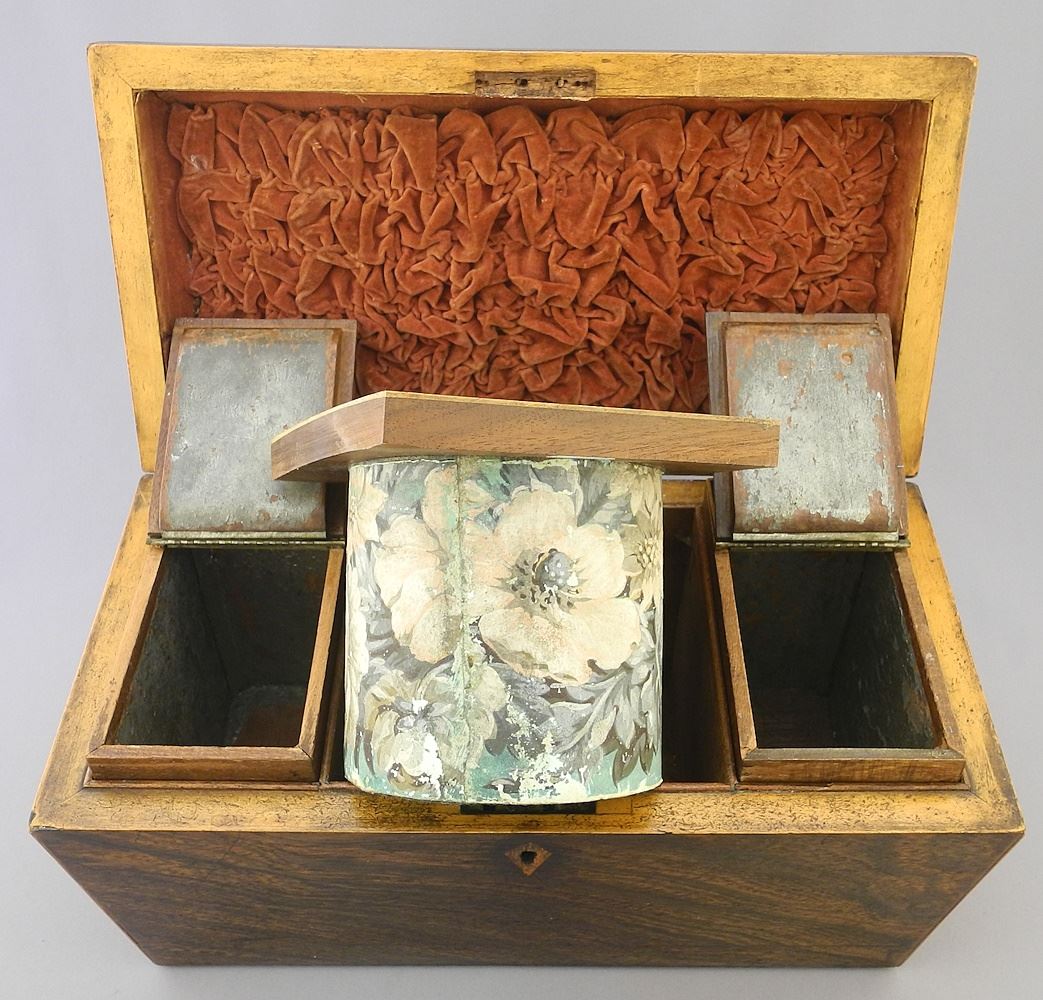 Rosewood Tea Caddy, Sarcophagus Form 6 1/2" x 12 3/4" x 6 1/2" (lock noted).