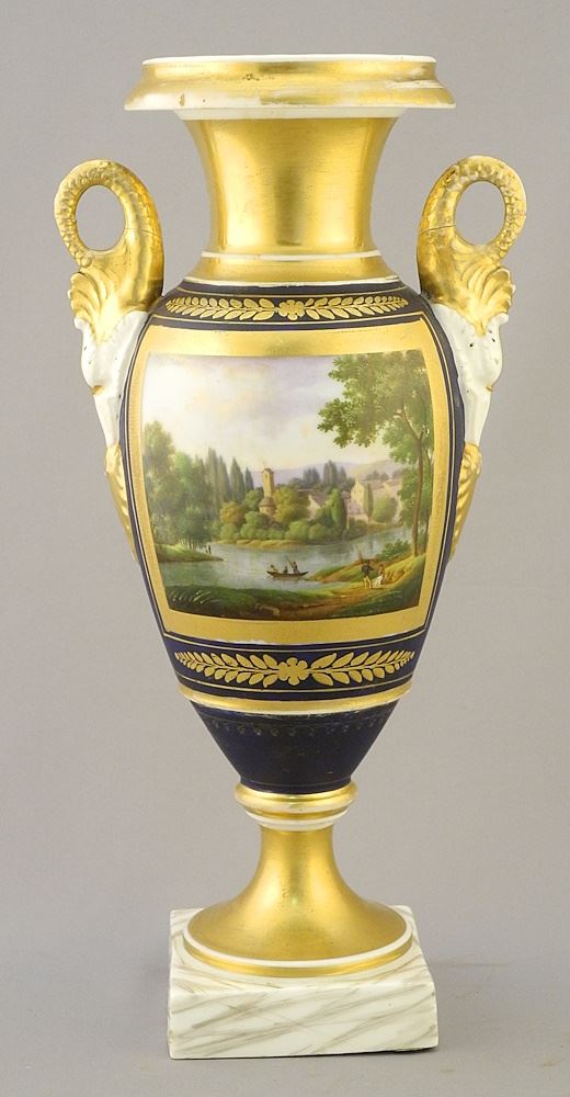 19th C. Porcelain Vase with Swan Handles (lower handles restored), 11"h.