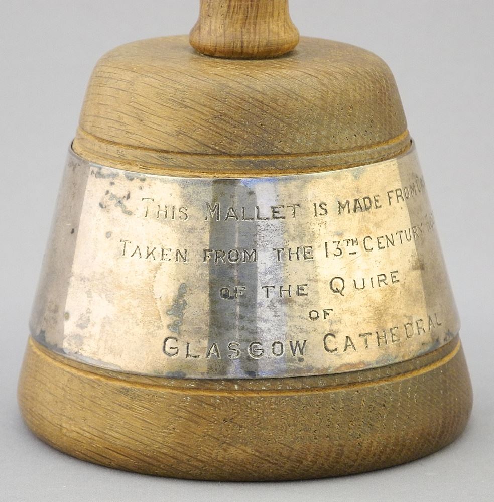 LOT 188 Silver Banded Oak Mallet: 13th C. Roof of the Quire Glasgow Cathedral in Case, 6 3/8"h. Estimate: $60 - $100 Sold For: $50 Auction Date: Tuesday, August 20 2024 at 4:00 PM