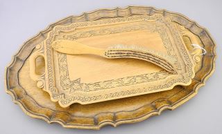 LOT 149 Oval Mahogany Tray (18 1/4"L) & Carved Wood Crumb Tray & Brush, 14"w Estimate: $60 - $100 Sold For: $30 Auction Date: Tuesday, August 20 2024 at 4:00 PM