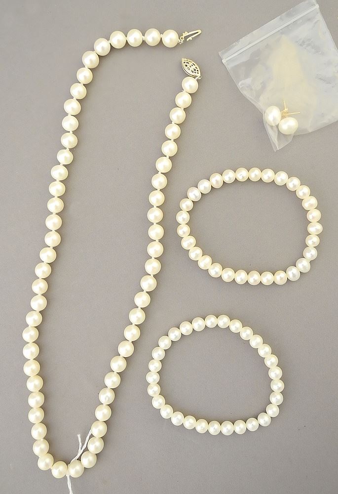 LOT 184 18" Pearl Necklace, 2 Bracelets & 14K Earrings. Estimate: $120 - $160 Sold For: $100 Auction Date: Tuesday, August 20 2024 at 4:00 PM