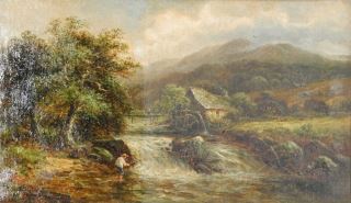 LOT 27 Oil on Canvas signed E. Watteau, 12" x 20 1/4", "Watermill on the Arran...Dolgellau Wales". Estimate: $100 - $200 Auction Date: Tuesday, November 19 2024 at 4:00 PM