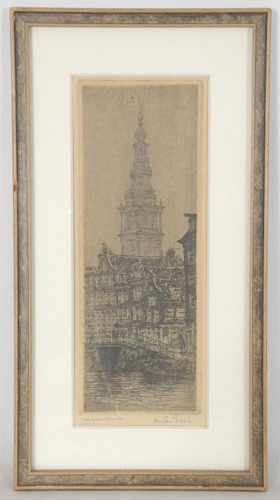 Etching signed Anton Pieck, Plate 7 1/4" x 2 5/8", "Southern Church Tower Amsterdam".