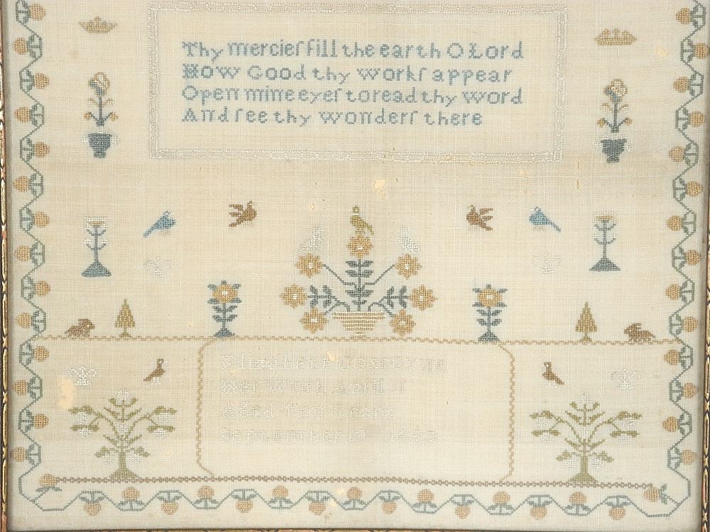 Needlepoint Sampler: Elizabeth Gascoyne April 11, Aged 10 Years, Sept. 1822, 13" x 12".
