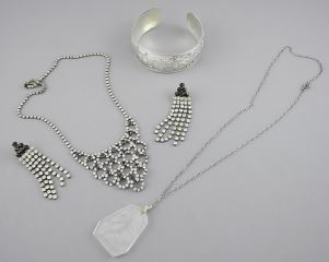 LOT 261 Vintage Rhinestone Necklace & Earrings / Silver (tested) Cuff Bracelet, 32g & Pendant. Estimate: $50 - $100 Sold For: $60 Auction Date: Tuesday, November 19 2024 at 4:00 PM