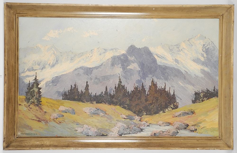 LOT 161 Oil on Masonite signed (Karl) Kronlachner, 25" x 42", "Mountain Pass". Estimate: $100 - $150 Sold For: $180 Auction Date: Tuesday, November 19 2024 at 4:00 PM