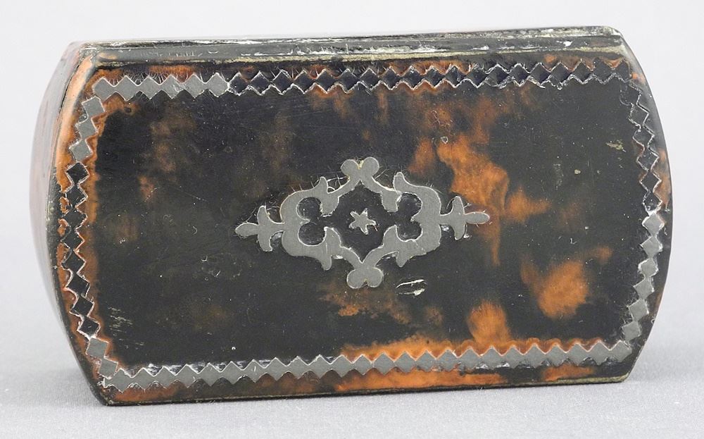 LOT 57 Georgian Papier Mache with Silver Inlay Snuff Box, 2 5/8"W. Estimate: $80 - $120 Sold For: $40 Auction Date: Tuesday, November 19 2024 at 4:00 PM