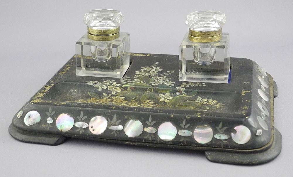 2 French Papier Mache Inkwells with Mother of Pearl (2 bottles), 9" x 11 1/4".