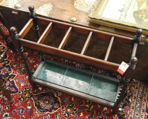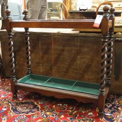 LOT 264 Mahogany Umbrella / Cane Stand with Original Drip Pan, 27" x 28 1/2" x 10". Estimate: $60 - $100 Sold For: $170 Auction Date: Tuesday, November 19 2024 at 4:00 PM
