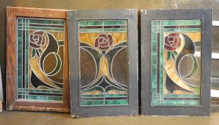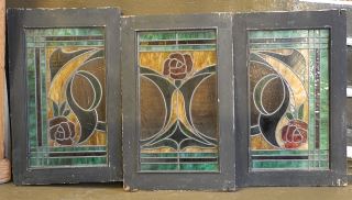 Three Leaded Glass Rose Motif Panels , Each 25 1/8" x 16".