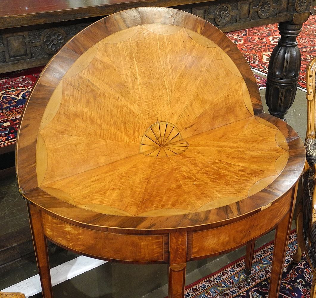 LOT 301 Banded Satinwood Fold-Over Table (won't close, top warped, veneer missing). Estimate: $60 - $100 Sold For: $150 Auction Date: Tuesday, November 19 2024 at 4:00 PM