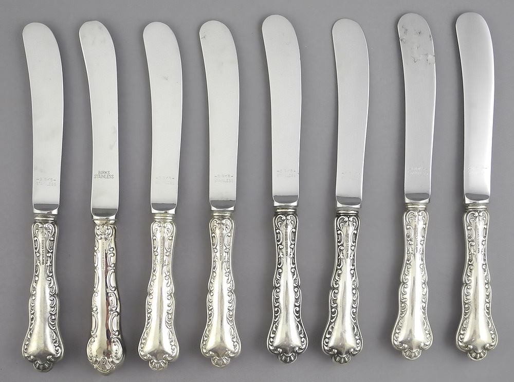 LOT 117 8 Birks Sterling Silver Butter Knives with Coronation & Souvenir Spoons, TW 470g. Estimate: $50 - $80 Sold For: $150 Auction Date: Tuesday, November 19 2024 at 4:00 PM