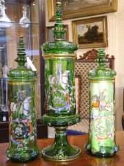 LOT 15 19th C. German Enameled Green Glass Garniture, 13" - 18 3/8"h. Estimate: $200 - $400 Sold For: $950 Auction Date: Tuesday, November 19 2024 at 4:00 PM