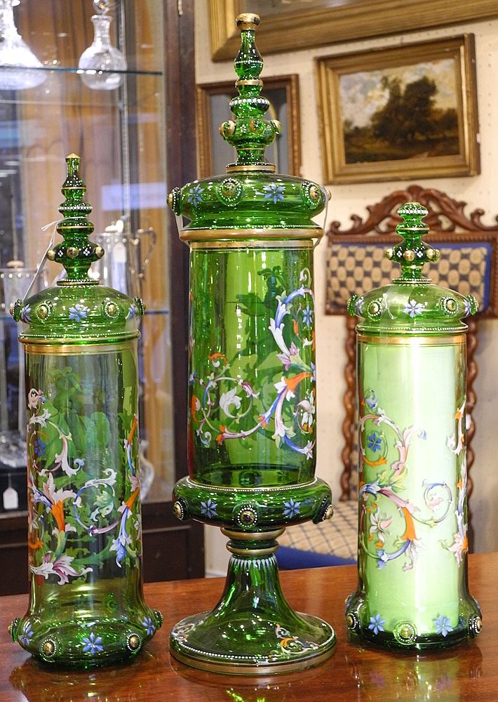 LOT 15 19th C. German Enameled Green Glass Garniture, 13" - 18 3/8"h. Estimate: $200 - $400 Sold For: $950 Auction Date: Tuesday, November 19 2024 at 4:00 PM