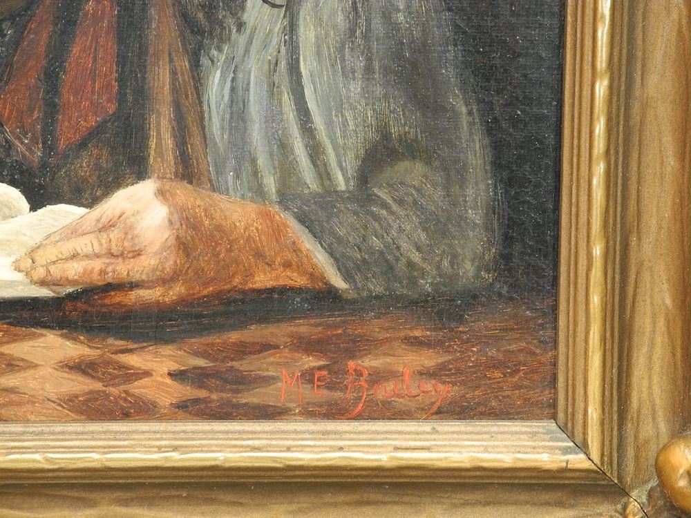 LOT 146 Gouache on Canvas signed M.E. (Mary Emma) Bailey, 9" x 11", "Reading by Lamplight". Estimate: $100 - $150 Sold For: $275 Auction Date: Tuesday, January 28 2025 at 4:00 PM
