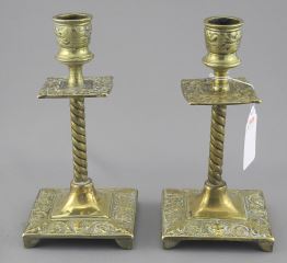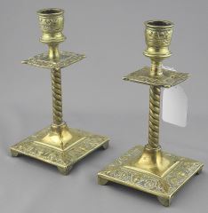 Pair of Victorian Brass Candlesticks with Mask Features, 6 5/8"h.