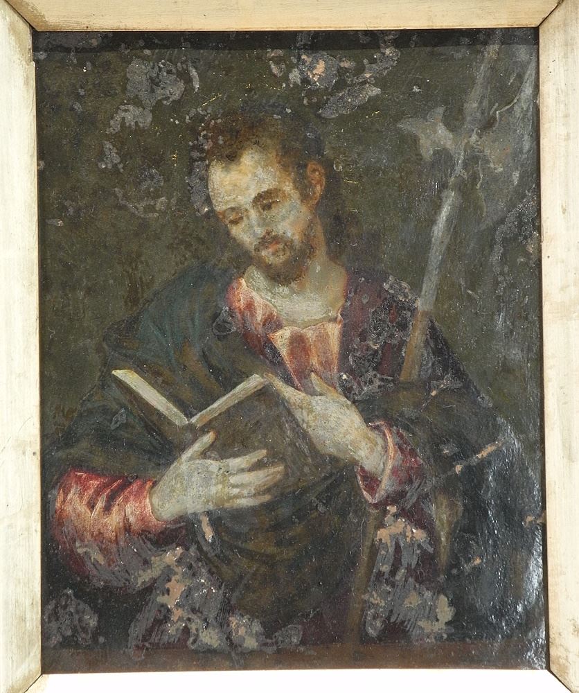 Antique Oil on Copper, 9 1/4" x 7 3/8", "Portrait of a Saint Reading".