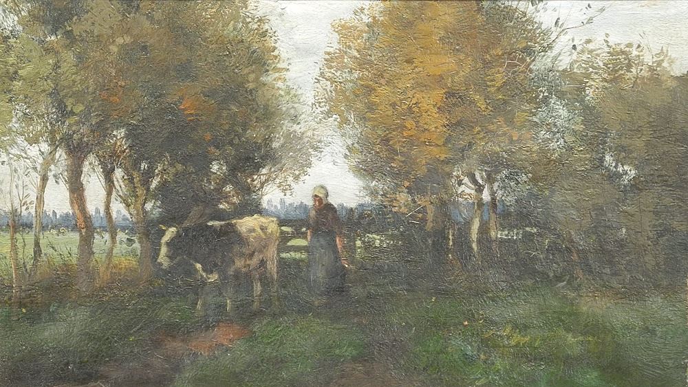 Oil on Canvas Attributed to W. (Willem) J.A. Jansen, 10 3/4" x 18 1/4", "Farm Girl with Cow"