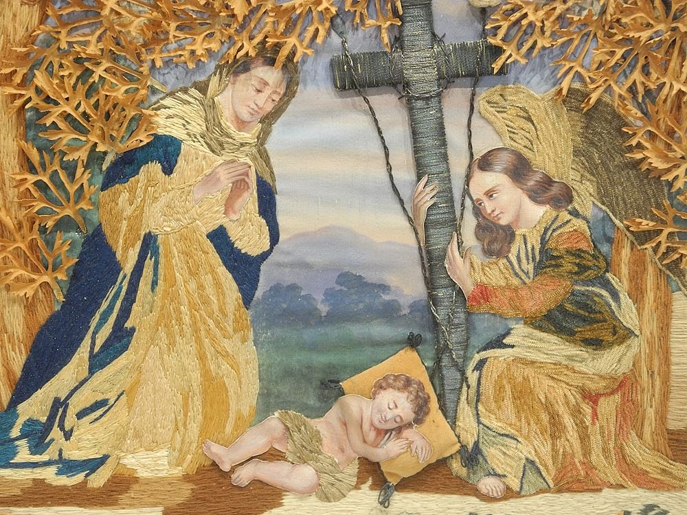 Gilt Framed 19th C. Needlework Diorama, 14 1/2" x 17 1/2" (corner noted).