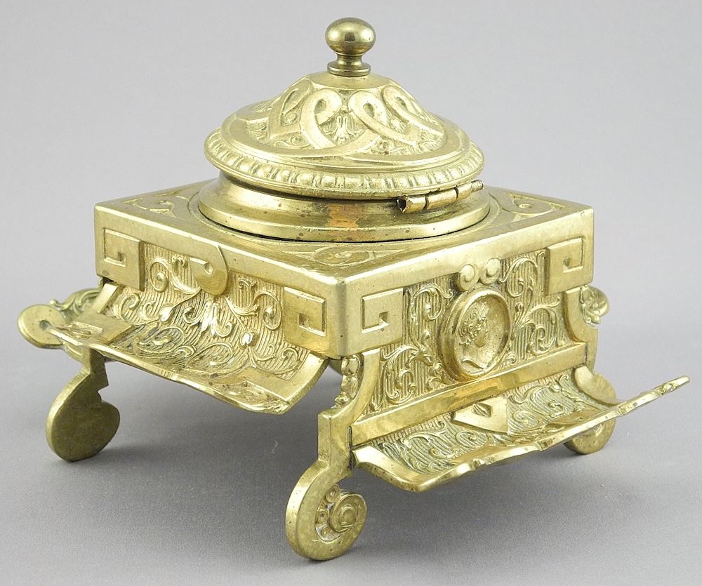 LOT 107 19th C. Brass Inkwell with Portrait Feature, 4 1/8"h (hinge noted). Estimate: $50 - $70 Auction Date: Tuesday, January 28 2025 at 4:00 PM