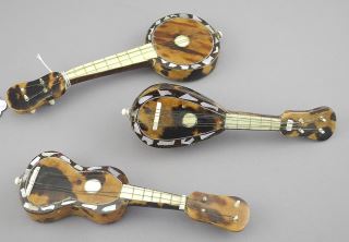 LOT 49 3 Tortoise Shell Miniature Musical Instruments, 5 1/4" - 6"h, NO EXPORT Estimate: $150 - $250 Auction Date: Tuesday, January 28 2025 at 4:00 PM