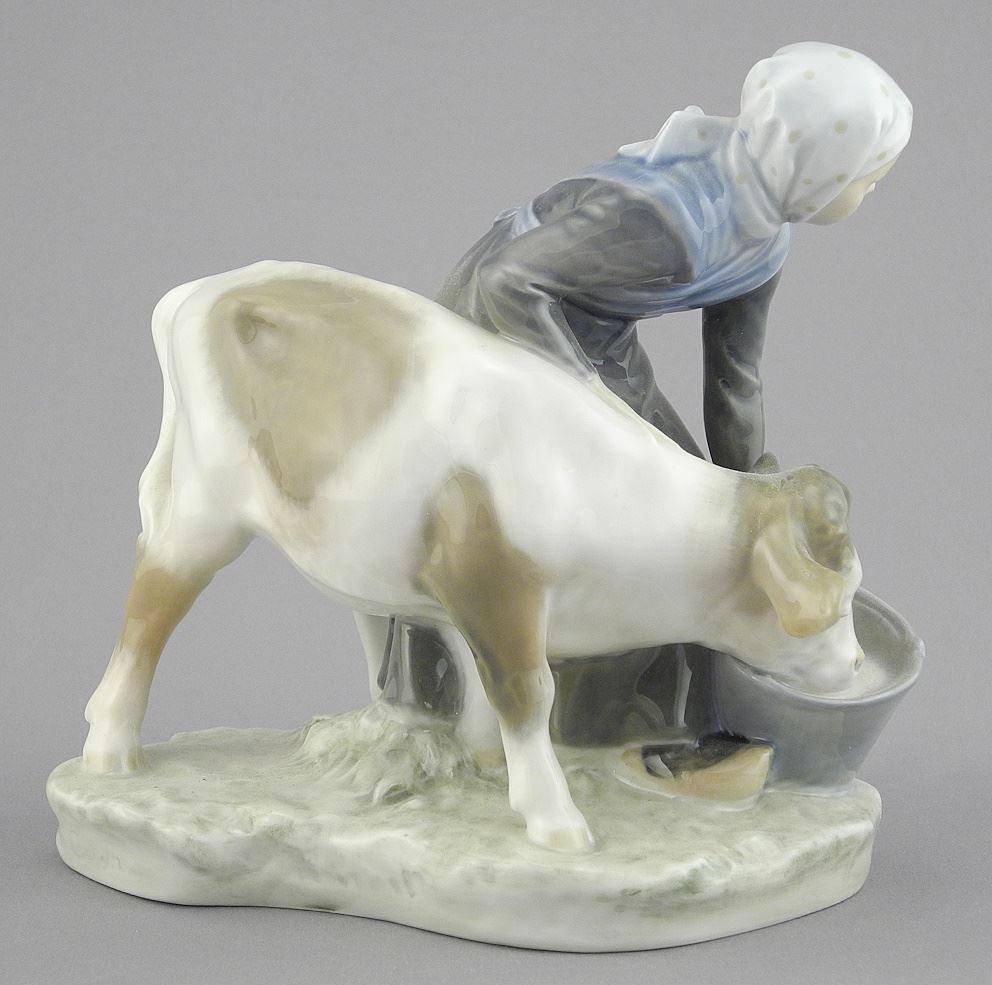 Royal Copenhagen Porcelain Figurine, "Girl Feeding Cow", 6 1/8"h.