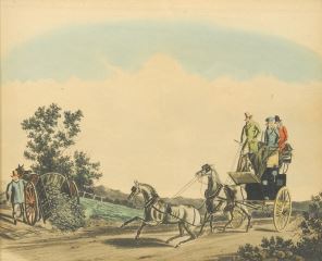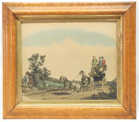 19th C. Bird's Eye Maple Frame with Coaching Print, Receives 11 x 13 3/4 ".