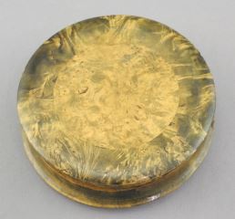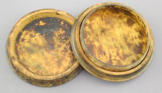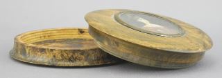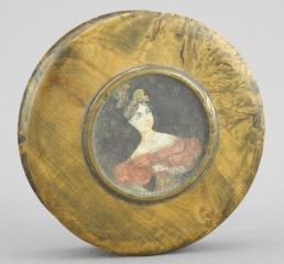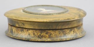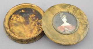 19th C. Burl Wood Snuff Box with Hand Painted Portrait, 3" Diam. (cover fits loosely).