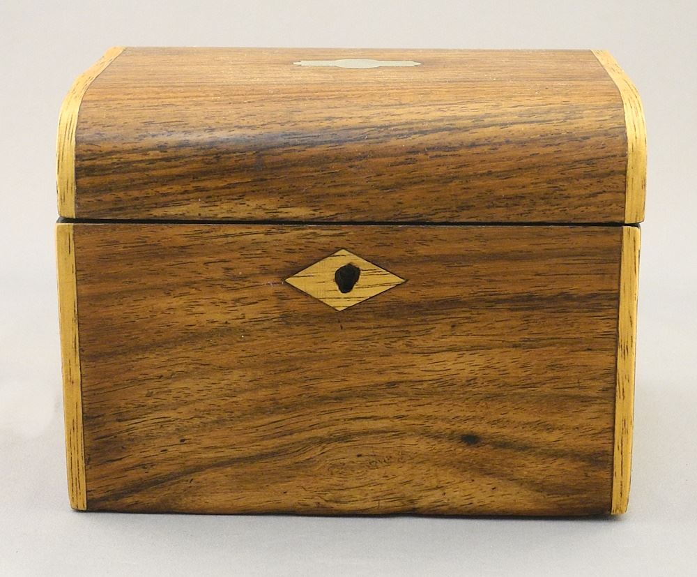 LOT 194 Banded Mahogany Tea Caddy, 4 1/4" x 5 5/8" x 4 3/4". Estimate: $100 - $150 Sold For: $100 Auction Date: Tuesday, January 28 2025 at 4:00 PM