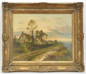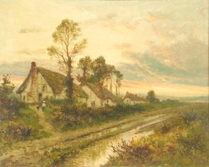 LOT 5 Oil on Canvas signed D. (Daniel) Sherrin, 15 x 18 1/2", "Rural Pathway with Cottages". Estimate: $200 - $300 Sold For: $275 Auction Date: Tuesday, March 25 2025 at 4:00 PM