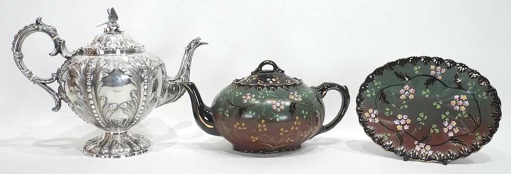 LOT 212 Collection of 19th C. Ceramics & Plated Tea Pot Including Rauenstein & Jackfield Black. Estimate: $60 - $100 Sold For: $60 Auction Date: Tuesday, March 25 2025 at 4:00 PM