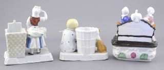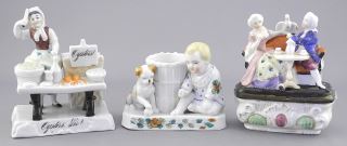 LOT 198 Three Porcelain Figures: "Oysters Girl" / Striker / Dog & Baby, 2 3/4" - 4"h. Estimate: $50 - $60 Sold For: $60 Auction Date: Tuesday, March 25 2025 at 4:00 PM