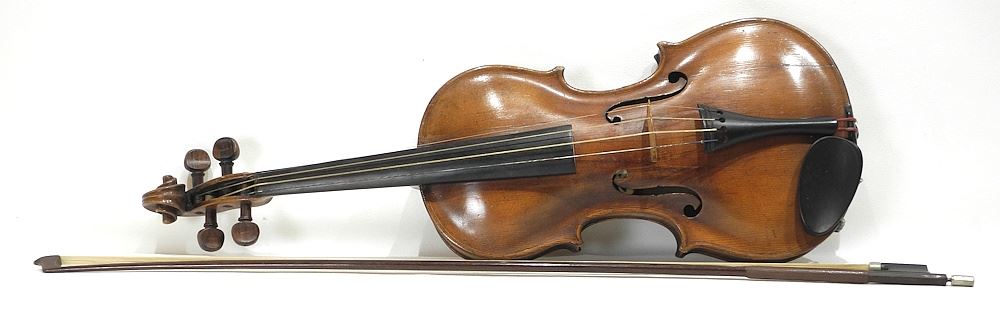 LOT 23 19th C. Violin (unsigned) with Bow (unsigned) in Case, 23 3/4"L. Estimate: $150 - $250 Auction Date: Tuesday, March 25 2025 at 4:00 PM