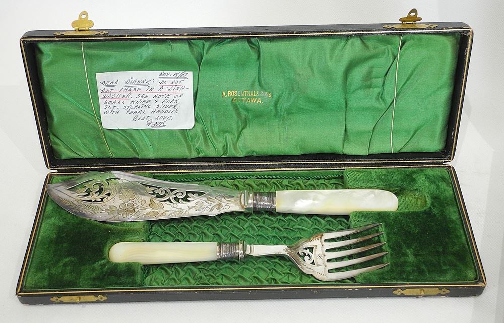 LOT 63 Two Cased Fish Serving Set (missing 1 knife) with Plated Chamberstick. Estimate: $50 - $60 Sold For: $50 Auction Date: Tuesday, March 25 2025 at 4:00 PM