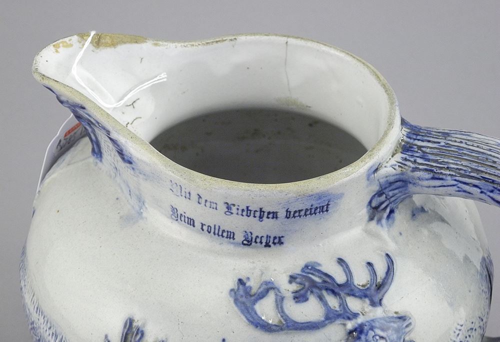 LOT 100 19th C. German Utica Salt Glaze Jug, 6 1/8"h (rim crack noted). Estimate: $50 - $60 Auction Date: Tuesday, March 25 2025 at 4:00 PM